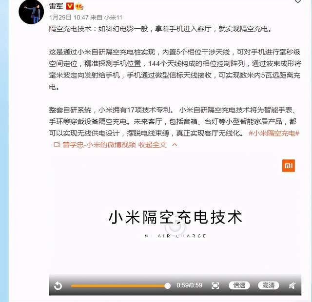 雷军微博发布:“隔空充电”从电影走出现实“,背后有17项自研专利