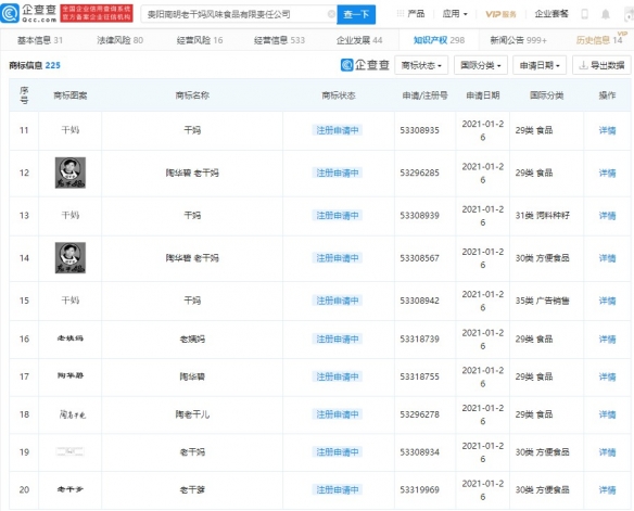 老干妈截止2020年7月,一共注册了192个商标,其中2008年为注册高峰期,